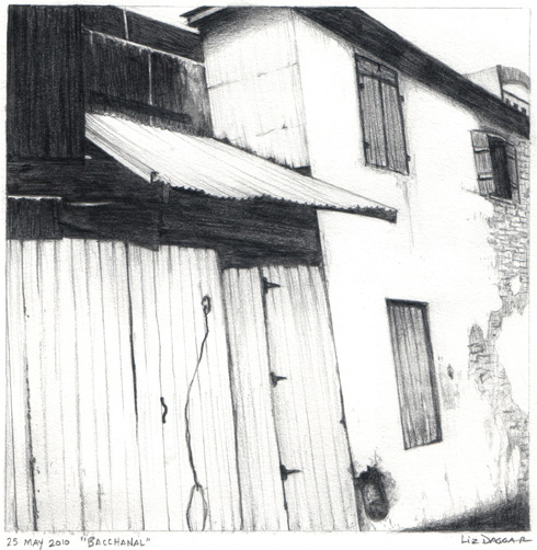 Here is a pencil drawing I did this evening of the wine store/bar in Bywater that Ben and I fell in love with. The place was at the ass-end of Chartres Street, in an Industrial/residential milieu that definitely grabbed our Brooklyn-based minds (Think Gowanus area). This patchwork-quilt of a building, in particular, looked like a gracefully crumbling chateau frozen in time between shotgun homes and the military base/aged-industrial bend in the wide river.