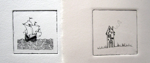 Yesterday was lo-fi lithography session two (read about out first session here). This time we came at it with drawings more suited to the medium– fewer tonal areas to get blocked up by ink. I’d read that thinning this type of ink is generally necessary to bring out fine detail when using polyester plates, but had none of the suggested thinning varnish to hand. We attempted thinning using a few drops of linseed oil instead, to poor results. The linseed oil made it far to easy for the ink to stick to the white parts of the plate, so I’ll have to order some varnish. With simpler images, however, the ink straight from the can worked well, though. Above are two of the images I worked with, each measuring about 2.125″ square. (The caravel drawing is new, inspired by the way the waves in the Viking Funeral came out; the tiny house was in an old sketchbook.)
