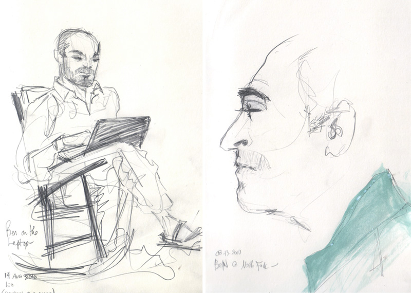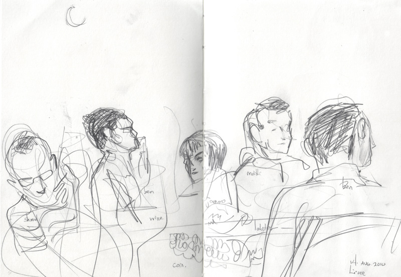 That is, the North Fork (of Long Island). Miscellaneous sketches from a weekend away, locally. Ben; the posse at delicious dinner table (it was a weekend of good foodie chefs in the house); and finally a random sketch began on Saturday evening, but finally finished this evening (at TWB in Exile’s first meeting). None of these from the weekend are terribly accurate– rather the opposite. But they capture the feeling, I suppose… That’s something.