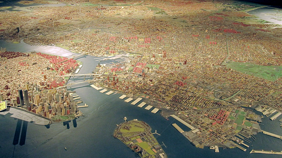 The impressive panorama of New York City at the Queens Museum of Art: Lower Manhattan and Governor’s Island in the foreground; Queens and Brooklyn in the background.