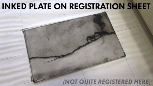 I made a registration sheet on which to place the inked plate to keep the press clean. There is a grid beneath the glass on the plate, but nicer to have one made just for your plate and paper size; less possibility for slipping; and nice to not have to clean the press…