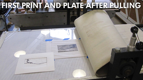 Here you can see my registration paper taped to the surface of the press, with the plate still on. Next to it is the first print I pulled, just having been lifted off the plate (note that it creates a mirror image). The paper is soaked in water for 10-15 minutes, then blotted, prior to pulling.
