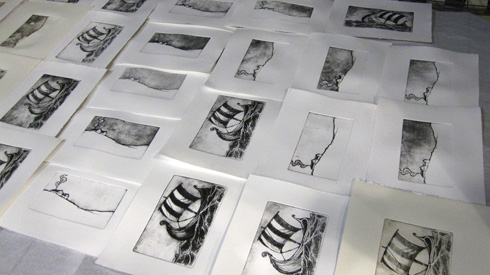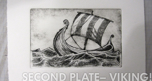 This image of the viking ship shows a nice balance of dark and light. You can see how the stripes in the sail and the uppermost ridges of the wood are the lightest area, where I removed all the ink from the surface of the plate.