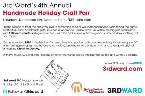 3rd Ward Handmade Holiday Craft Fair!! Posted on Wednesday,1 December, 2010Thursday,2 December, 2010 by edaggarart Come for Electrofork jewelry and art! Stay for the music, food and drinks! THIS SATURDAY, DECEMBER 4, Noon-6pm at 195 Morgan Ave in Brooklyn!! Two Floors of Shopping and Fun! Share Click to share on X (Opens in new window) X Click to share on Pinterest (Opens in new window) Pinterest More Click to share on Facebook (Opens in new window) Facebook Click to email a link to a friend (Opens in new window) Email Click to share on Tumblr (Opens in new window) Tumblr Click to share on Pocket (Opens in new window) Pocket Like Loading... Related