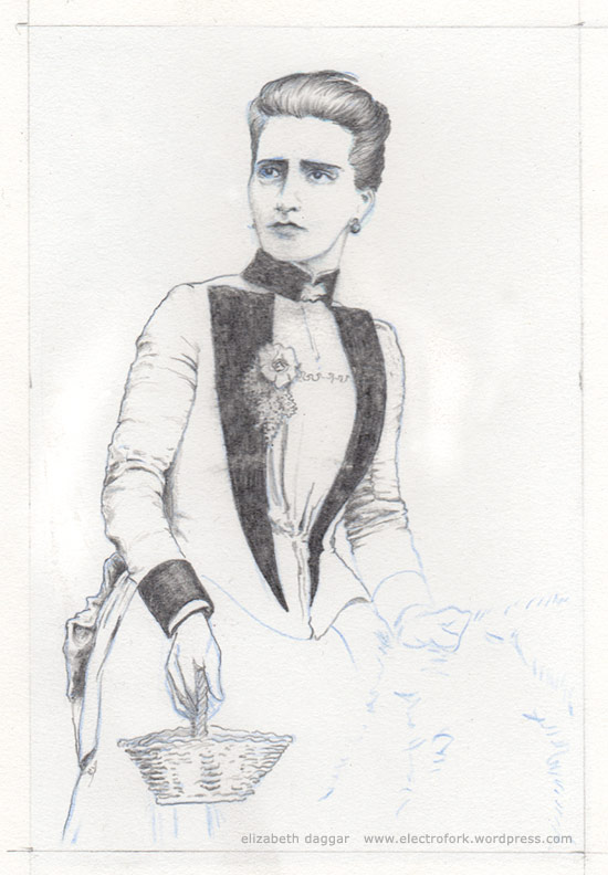 UPDATE: Below is the proof after starting from scratch. Her face came out not as subtle or lovely, but I will be working on that one very dark eye, as well as doing some spit-bite in the background.
