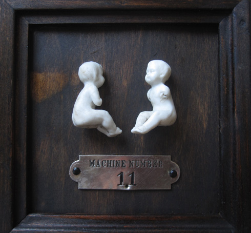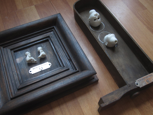 Art! A sunday spent in air conditioning, making a mess and making a couple of assemblages. The one on the left involves a frame that was sent to me years ago by Beth (The Mad Framer). I cut a small piece of wood for the backing, and stained everything with dark walnut before adding the twins and metal tag. One twin faces inward, and the other outward (see detail after the jump). They (and the angels) are made of bisque, and were unearthed in Germany where a doll factory had been before the war. (Frozen charlottes are one of the most common type of porcelain dolls found in similar circumstances, of which I have two as well.) The piece on the right is contained within a drawer from an antique table; I love the arch— love that a part of a piece of furniture which would never have been seen was artfully crafted into a beautiful curve. The angels’ halos are sterling jewelry wire. I will try to get better photographs of both pieces at some point (hanging on a wall, and using a tripod.)