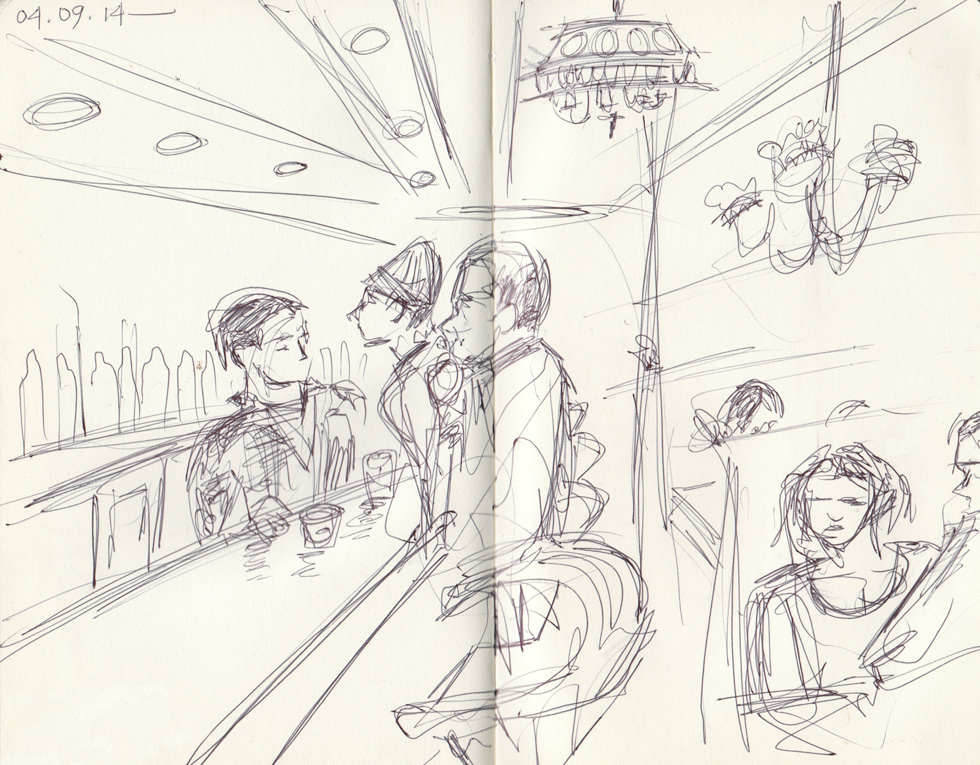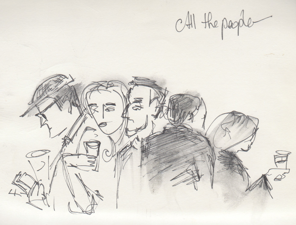A nicely rounded decrescendo of humans absorbed in devices, drinks and perhaps conversation. Clearly not all the people, but a handful to represent the lot. Their gradual rotation puts me in mind just a little of Duchamp’s Nude Descending a Staircase— motion implied in a still (though miles more primitive in this case). Another even sketchier sketch after the jump.