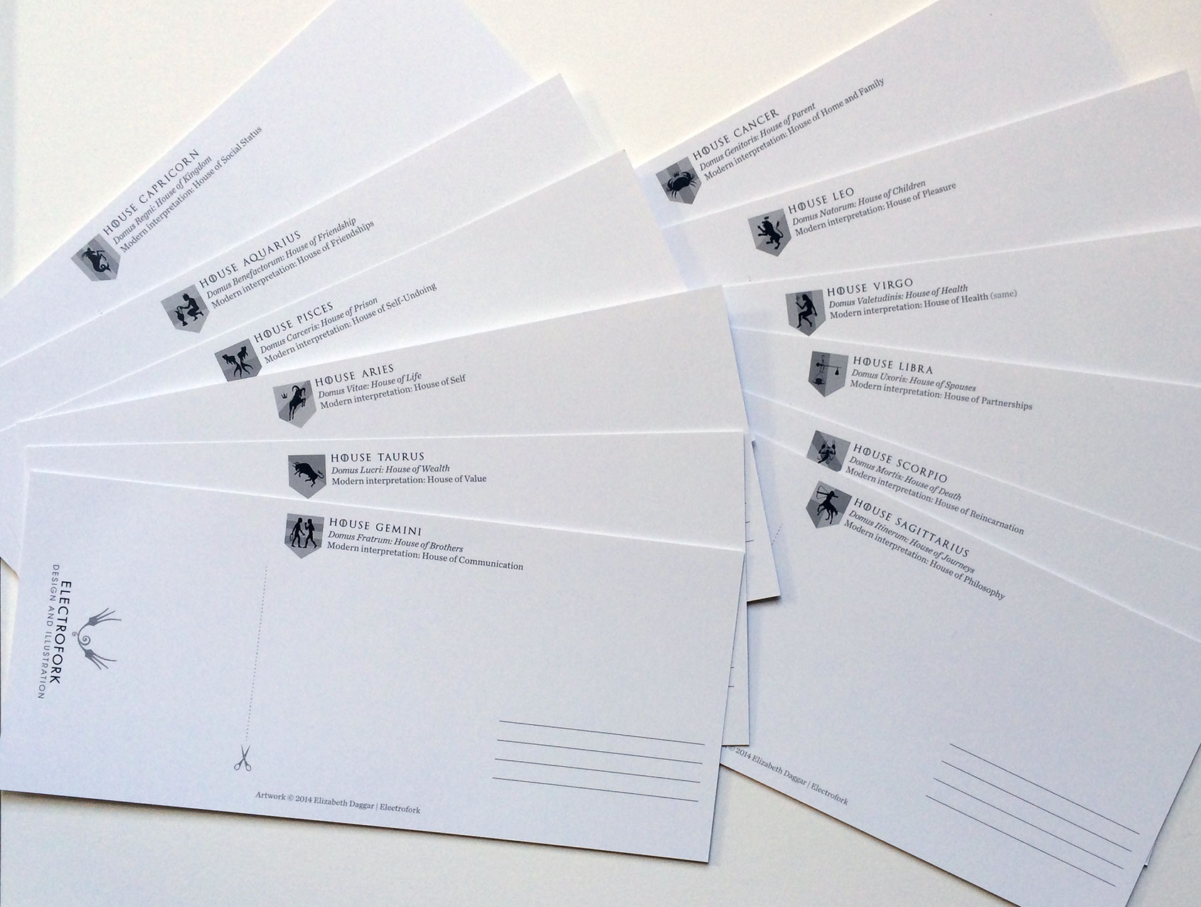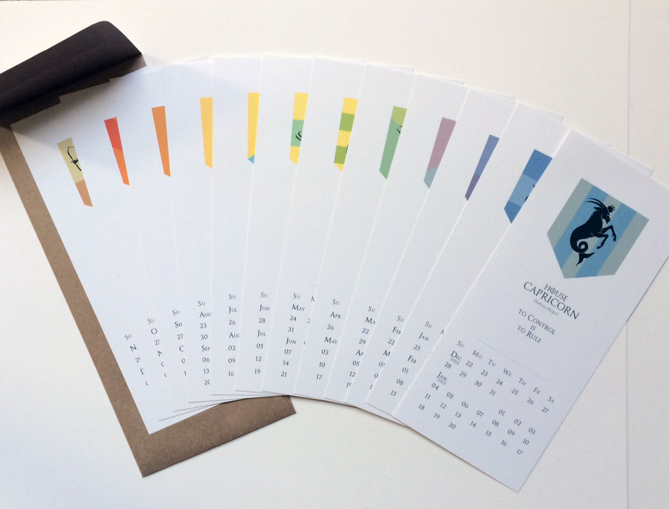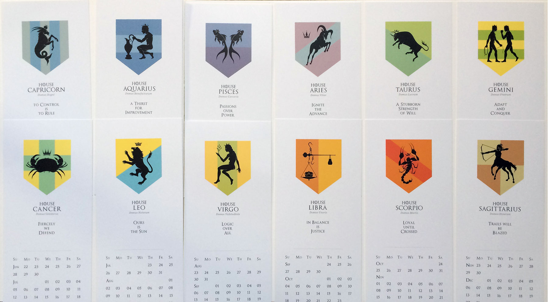 As I posted about a lot over the past few months, I’ve designed a calendar based on the signs of the Zodiac, but re-invented as house sigils or shields, complete with a house motto that distills the nature of each sign to a single phrase (as in the Game of Thrones series and the long heraldic tradition that inspired George R. R. Martin’s family house structures in his books). The grid of days for each month is not by the month, but rather by the days covered by each sign, as you can see in the photos.