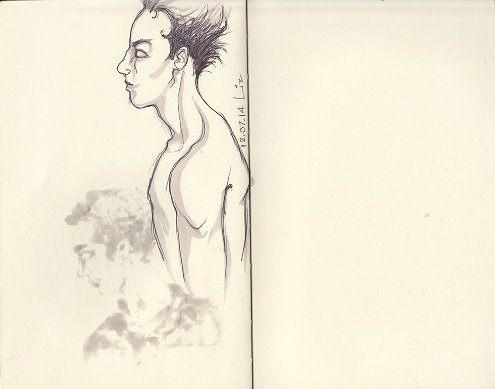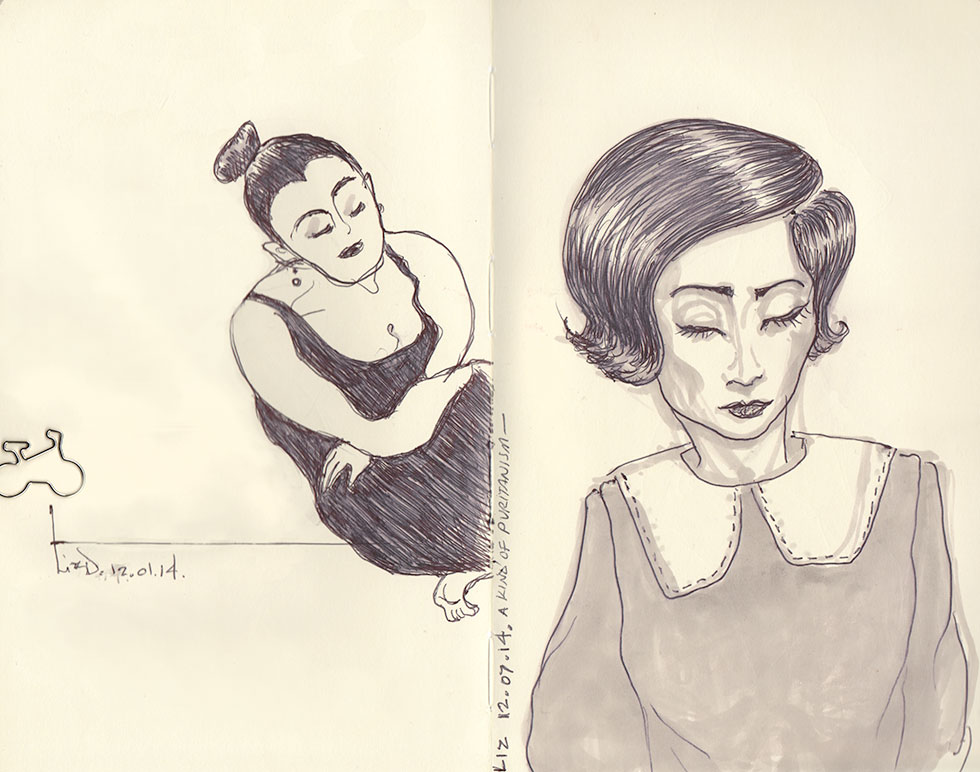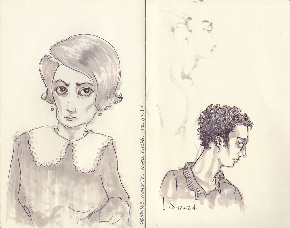 The Moleskine from the trip to Europe got filled up within a day or two after I returned, so I bought a new one a couple of weeks ago. The watercolor drawing up there was from our trip to the cabin in NJ. The drawings below are ones I did last night with one of my trusty markers (brush tip, 40% grey) and a ballpoint pen. The marker bleeds through, as you can see, so that prim-looking woman wound up with a doppelgänger on the obverse of the page.