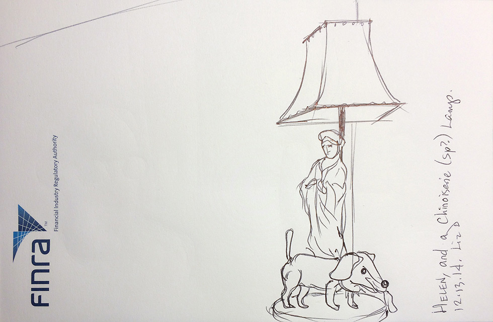 The metal dachshund sculpture with one of the vintage Chinoiserie lamps; metal dog invoking S.P’s Helen, now departed.