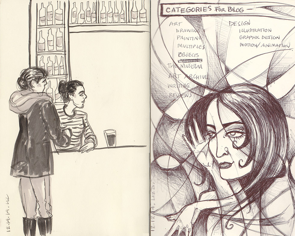 A couple of offerings from the Moleskine that turned out decently from last weekend. Also, a photo of my European-trip-inspired shadow box sporting a Parisian pigeon feather, a lens from a vintage vision-test optics machine, and a bit of dried flora plucked from Flevopark in Amsterdam on the day we cycled to the Distilleerderij ‘t Nieuwe Diep, sadly closed for the season.