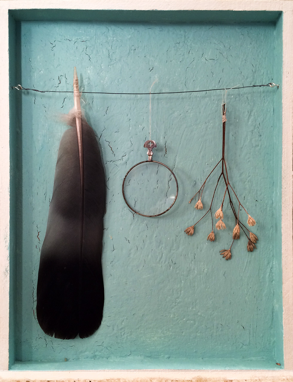 Else: Tiny screw-eyes into the walls of the box; fine-gauge wire strung across, wrapped, then further tighten screw-eyes to straighten the inevitable sag. White thread through and around the feather (with a needle); wrapped around the two little branches of dried flowers; thread ends left long enough to tie around wire. Same with lens. (But all that is fairly visible.)