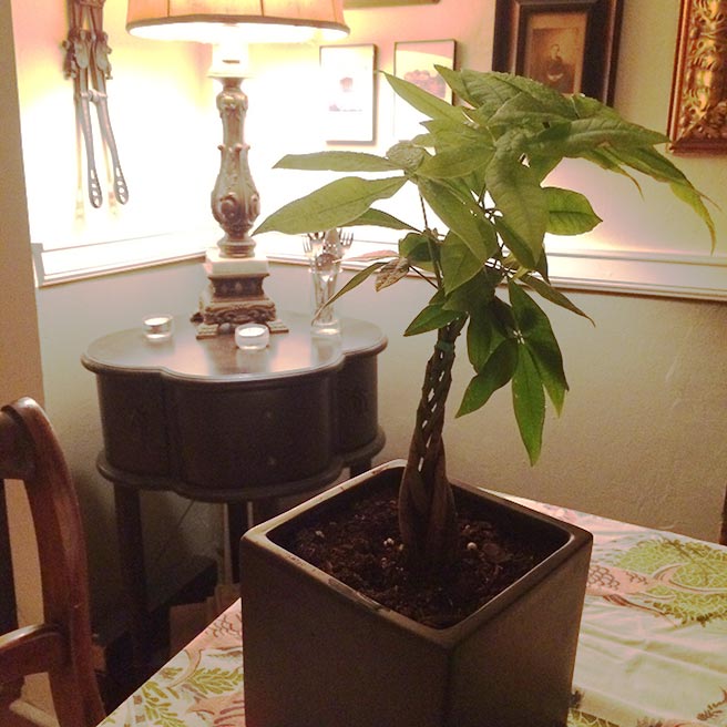 On the way home, stopped at the grocery store for a few things and bought a fancy little tree— braided! It’s a Malabar chestnut (Pachira aquatica).
