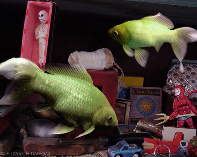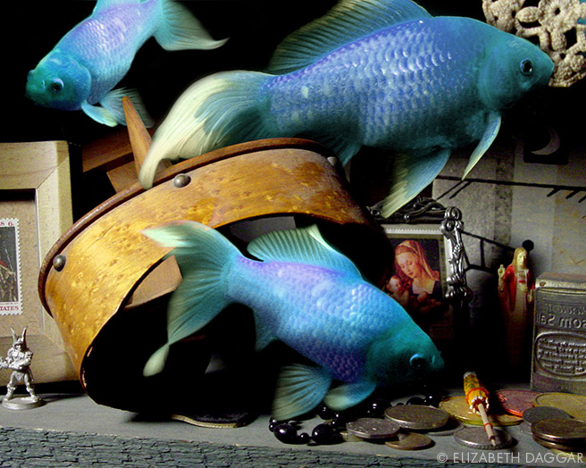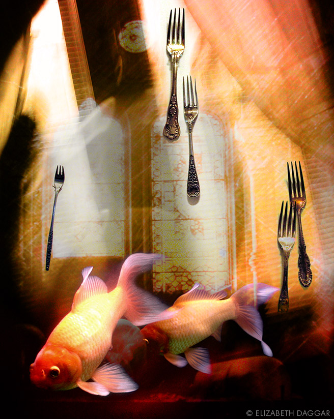 Here are some photo collages I did in 2000-2001. Three of these feature my old pond comet, the mighty Serial Fish, frolicking amongst my belongings, and swimming through the cathedral of floating forks.