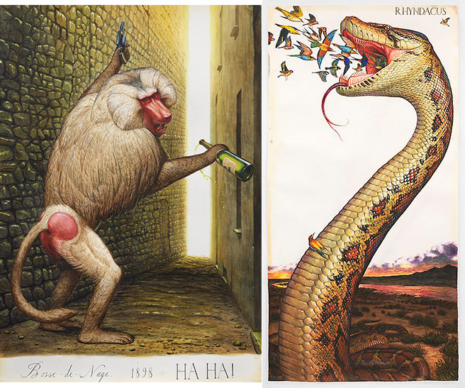 At first glance, much of his work calls to mind zoological studies from the turn of the last century, but are often infused with a sense of humor or surrealism. They’re large, sprawling canvases, arresting in their detail and vividness.