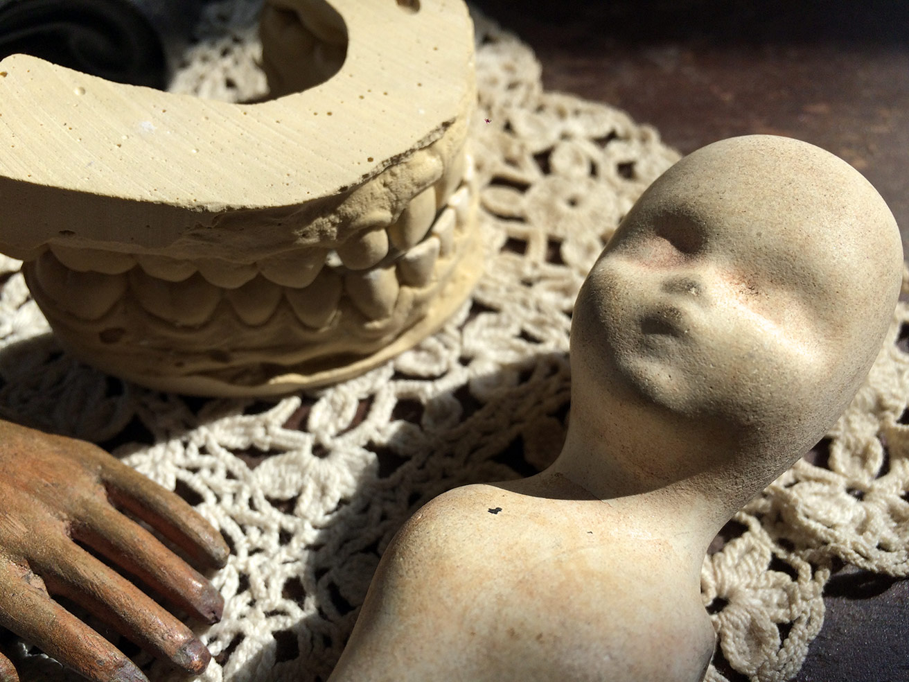I obtained a new piece Sunday; the broken body of a bisque or porcelain doll. Not a Frozen Charlotte, but of the same period. She’s beautiful and sad and a touch creepy (as are all dolls), sharing space now with a dental cast of Z’s teeth that he gave me upon arriving. Now I can see his smile every day, haha.