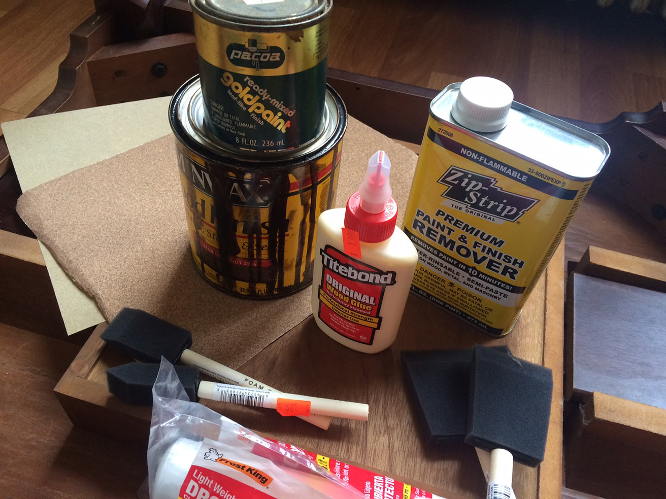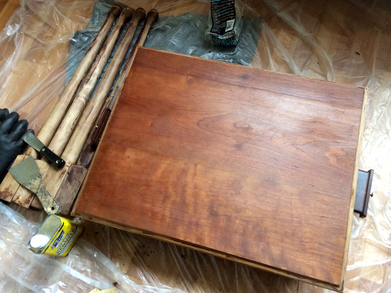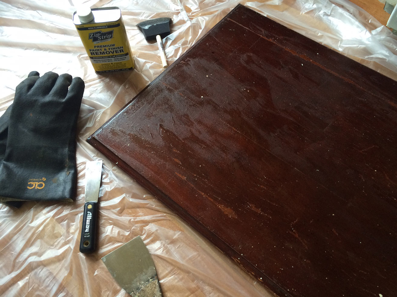 Drop cloth in place, the top surface is ready for stripping. Heavy duty gloves and disposable foam applicators, as this stuff is destructive (it will eat through latex gloves, don’t use ’em).