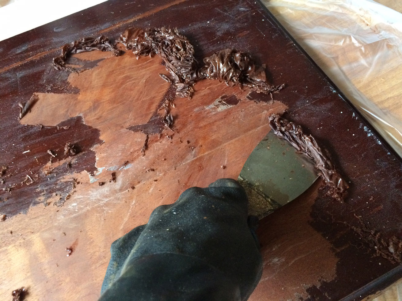 I used the fast-working type of stripper (with windows wide open and fan on on a very breezy day). Slather it on the wood— thick so it doesn’t dry too fast. You have to scrape the coating off while it’s still wet or it gets hardened.