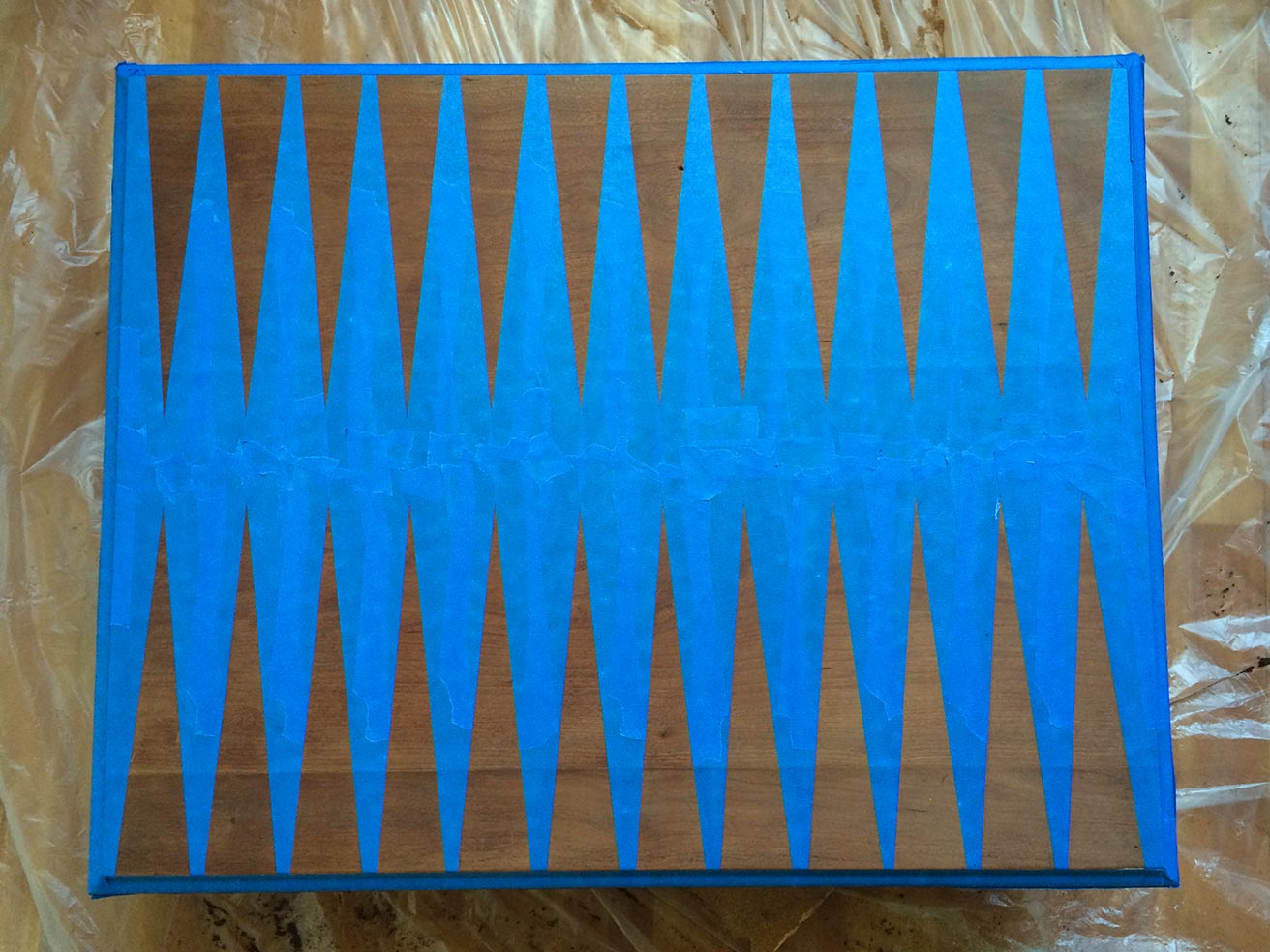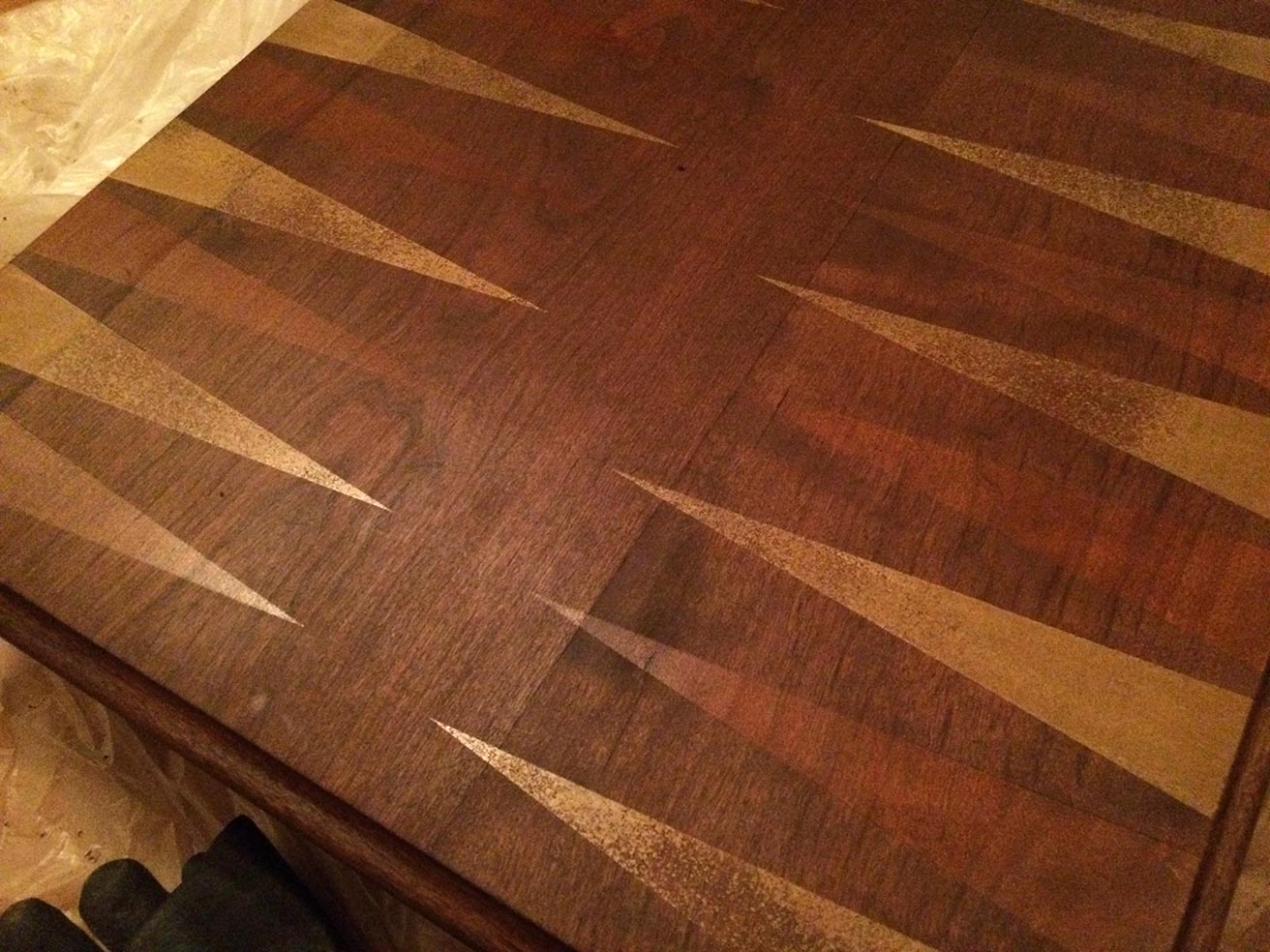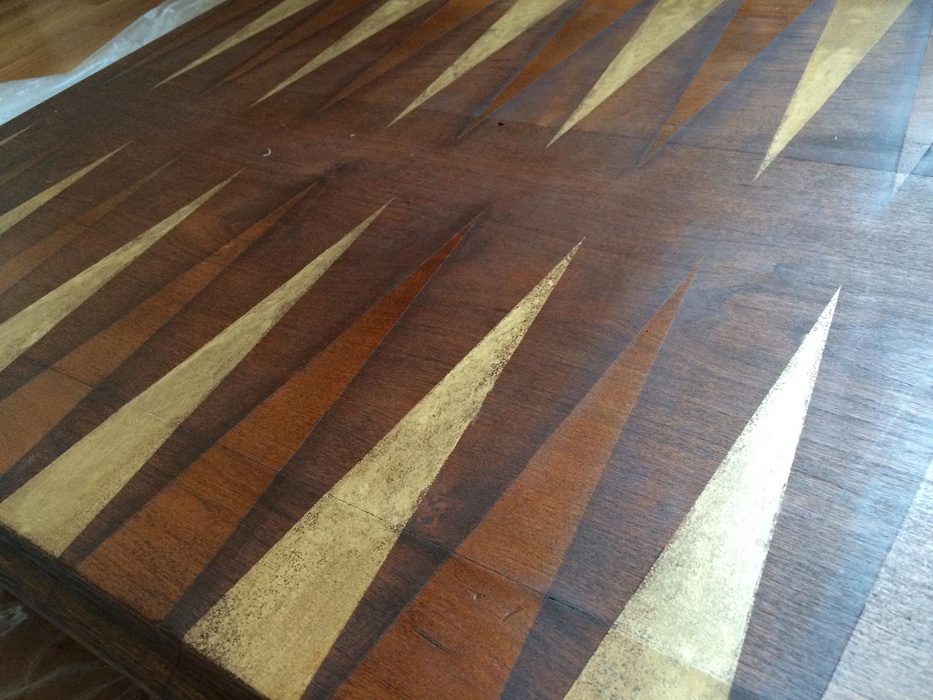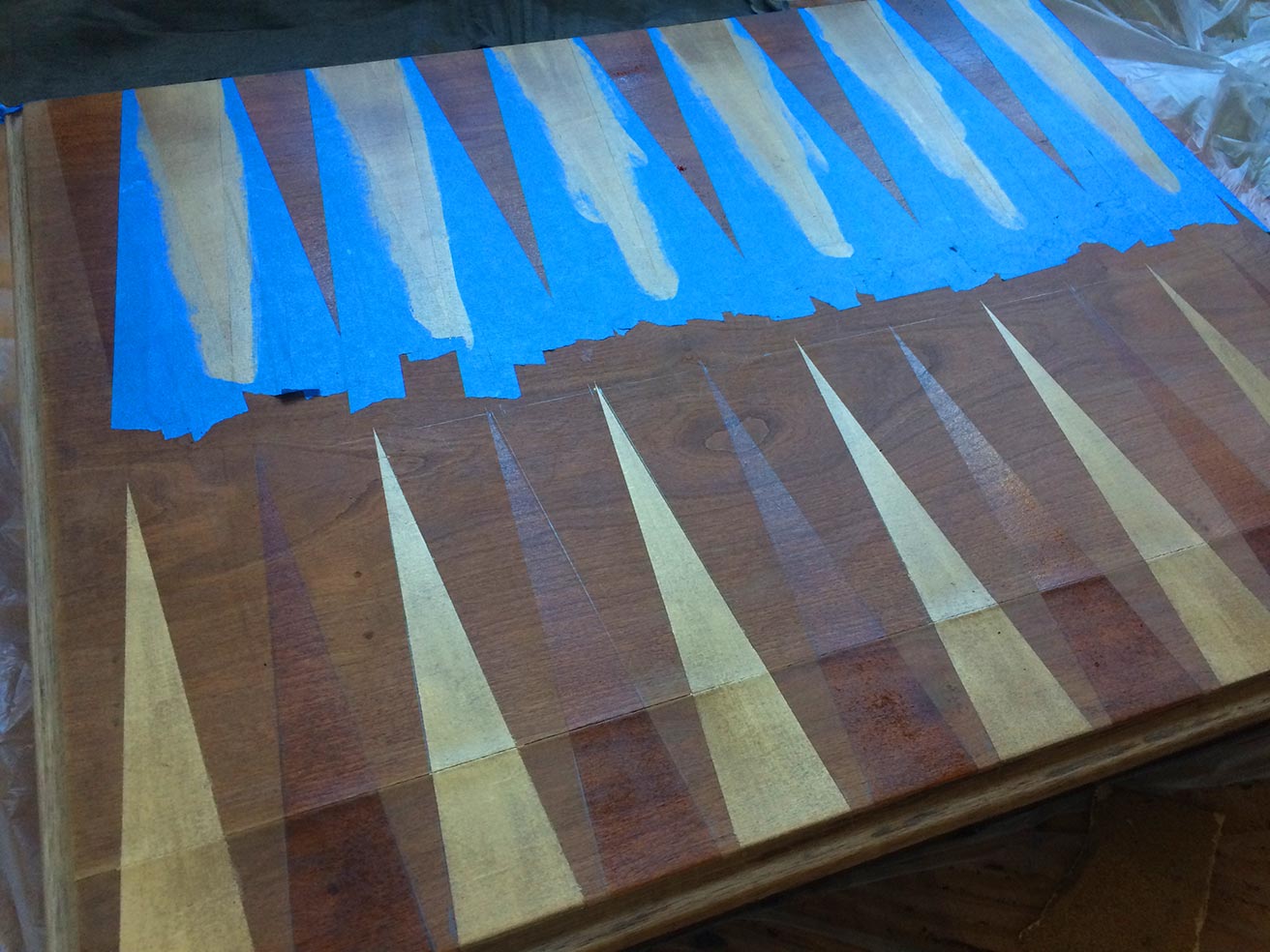 I decided I wanted a subtle sort of Backgammon pattern on the top surface. Having seen how beautiful the wood beneath the old finish is, I’ve elected to leave half of the diamond-sharp points natural, paint the other half metallic gold, and the remaining space will be completed with stain similar to the body of the table which I left intact.