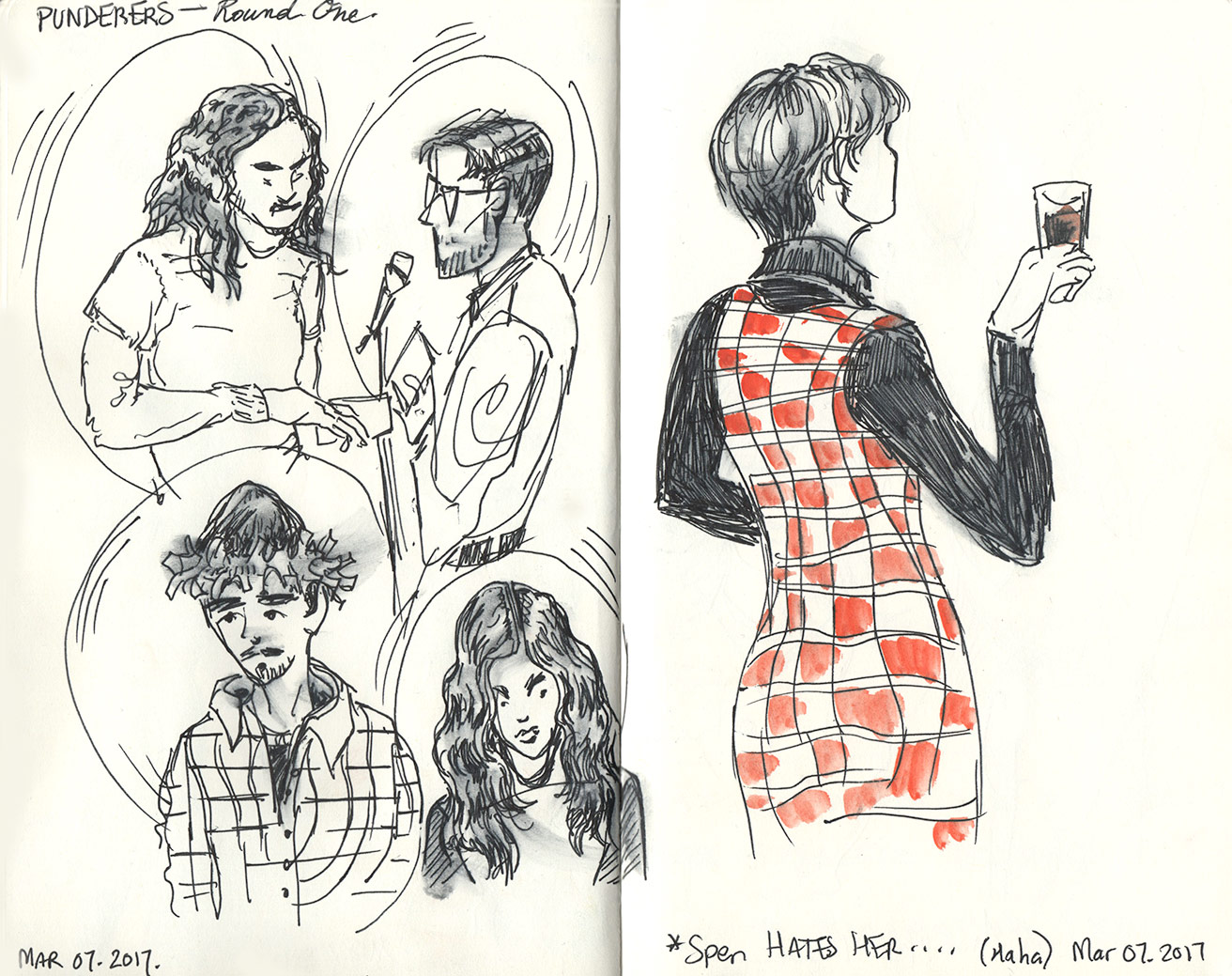 Some fun sketches from Punderdome at Littlefield on Tuesday eve, where a few of us joined Adam on his birthday. This exceedingly well-attended and sold-out event provides entertainment of maximum word-nerdiness amid flurries of index cards and timed deliveries of puns.