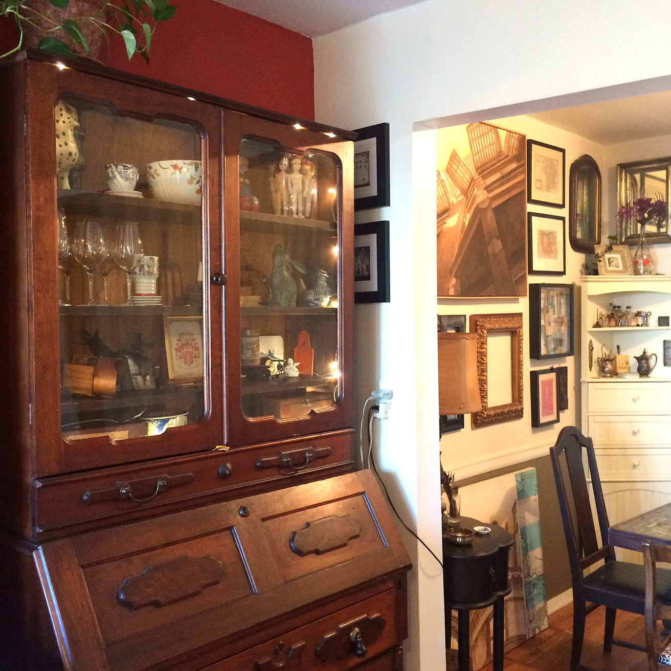 You may recall a post in which I talked about getting a new (to me) piece of furniture for the nook between the kitchen and the dining area of my apartment. The secretary in question arrived a couple weekends ago, a piece from the childhood home of a dear friend of mine. Before it arrived, I cleared that wall and painted it as per my plan.