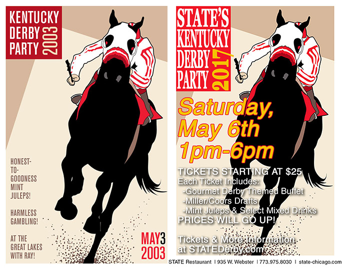 As I was perusing Google image for visual inspiration, I spotted a thief, caught in the act! Below is a poster (right) for an event in Chicago, whose promoter or venue blatantly stole my 2003 Derby poster for Ray (left), and then obliterated its elegance with godawful type treatments for a Derby Party.