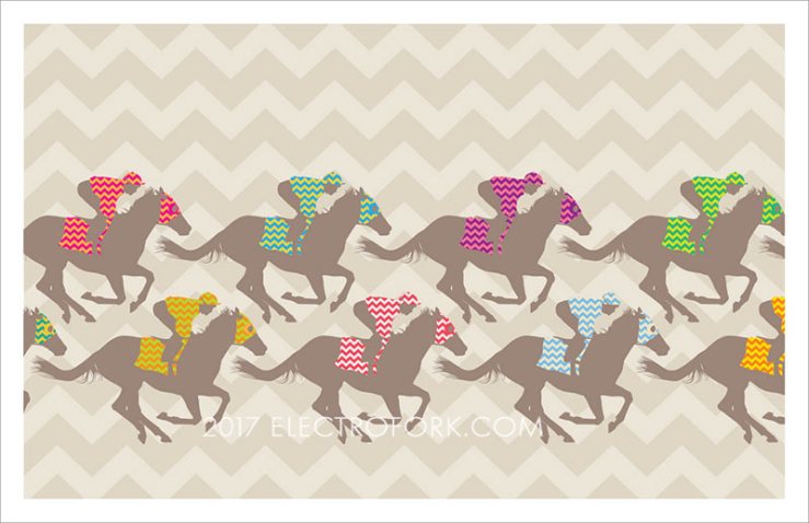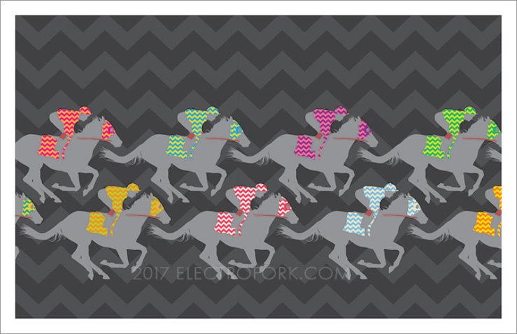 I decided against the stained glass approach in the end. I Chose instead, to focus on repeated patterns— a race horse silhouette, with the silks in the spotlight, and a larger repeating pattern behind them.