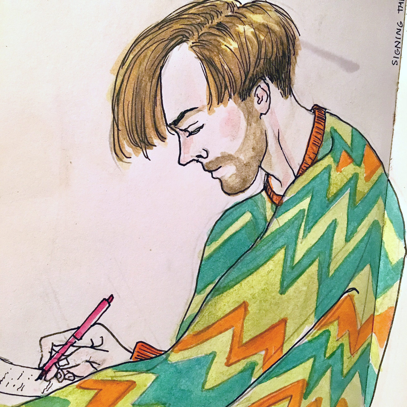 And below a photo I snapped of it in progress, before I’d decided to keep on painting and add a setting, an atmosphere. (His hair was better before I got so fussy with the markers.)