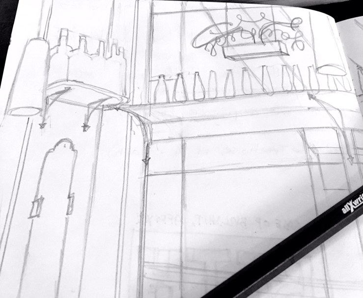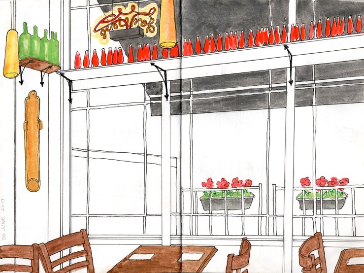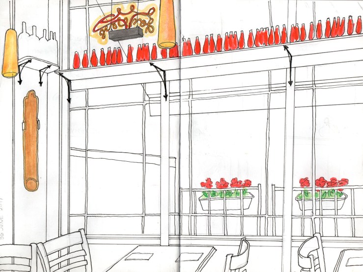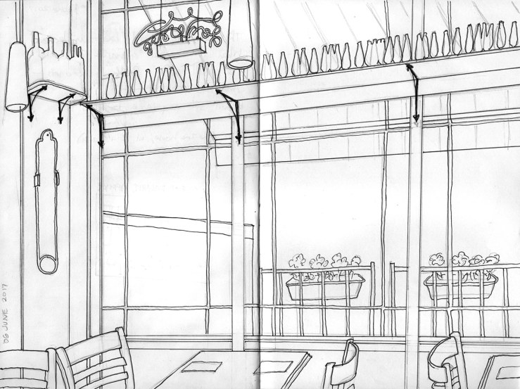 In the end I erased the stripes on the awning. Really, when I put them in (they were imaginary), it was mainly with the objective of simply keeping track of what was what— so many lines! I used the menu at the restaurant a lot as a straight edge.