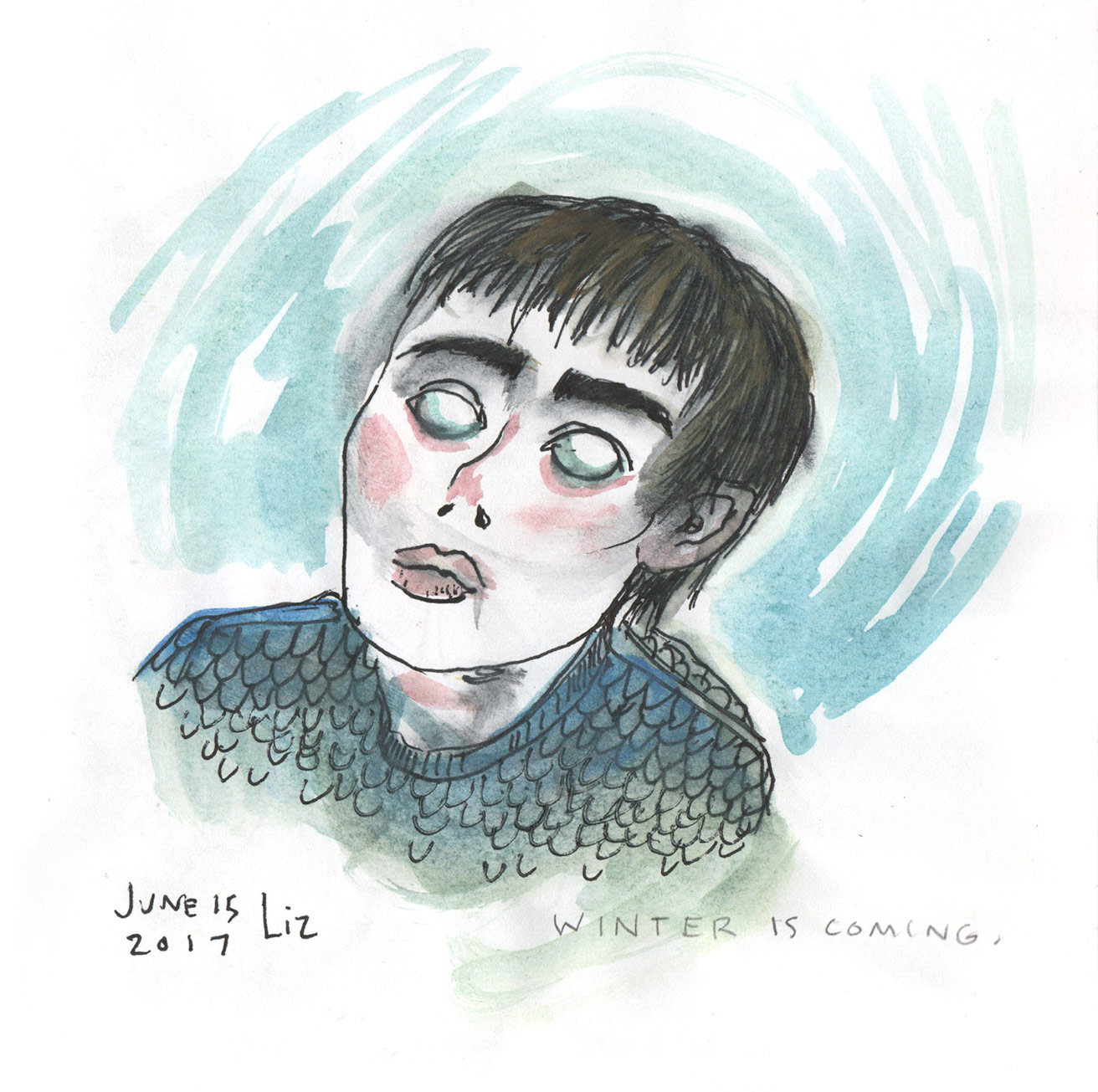 A couple little do-dads. Above, from the sketchbook, a quick rendering of Bran Stark in Game of Thrones, season six.