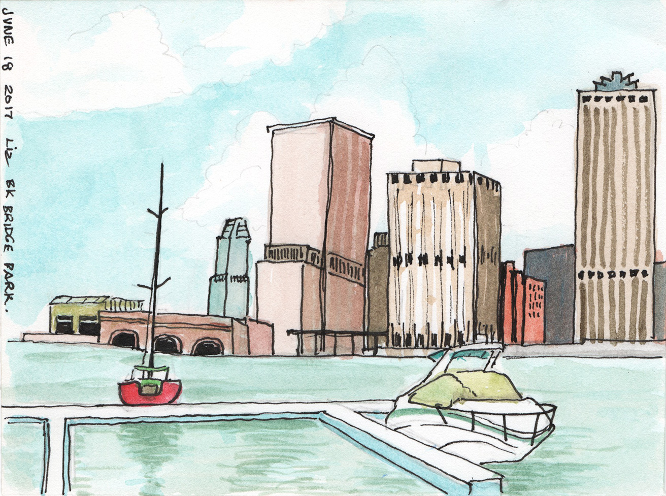I need to loosen up a lot more when sketching architectural things, be less literal. The finished piece is far too on-the-nose— timid, and lacking dynamics. My treatment of the buildings while inking flattened that expanse of the harbor. But learning happens through failing!