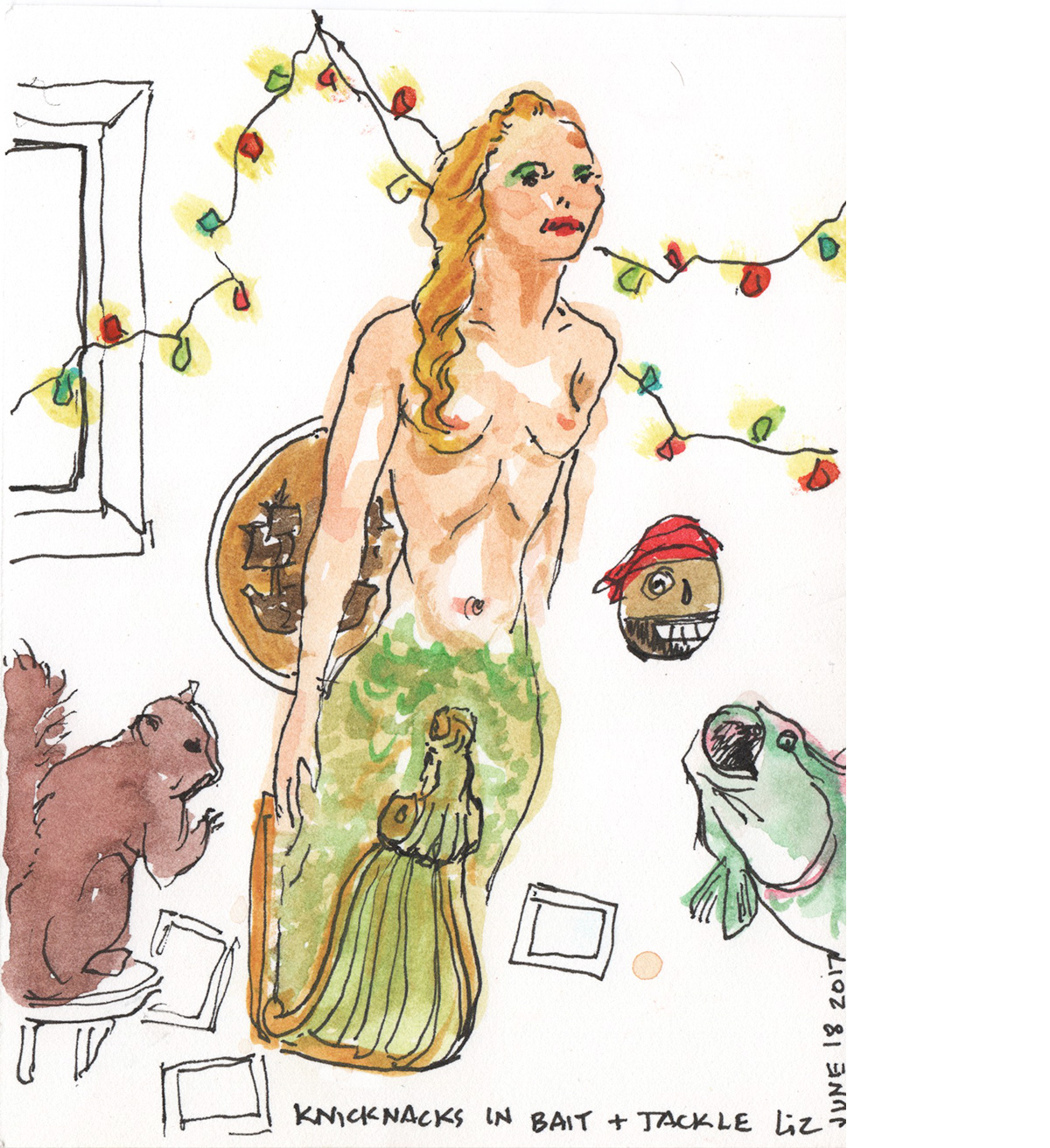 Then I took the bike path to Red Hook, where I had a pint at Bait & Tackle and sketched just a few of the many, many nautical and taxidermy knickknacks. And finally, I headed next door to Ice House, where I did some sketches of people in the backyard. Those sketches in the next post, stay tuned!