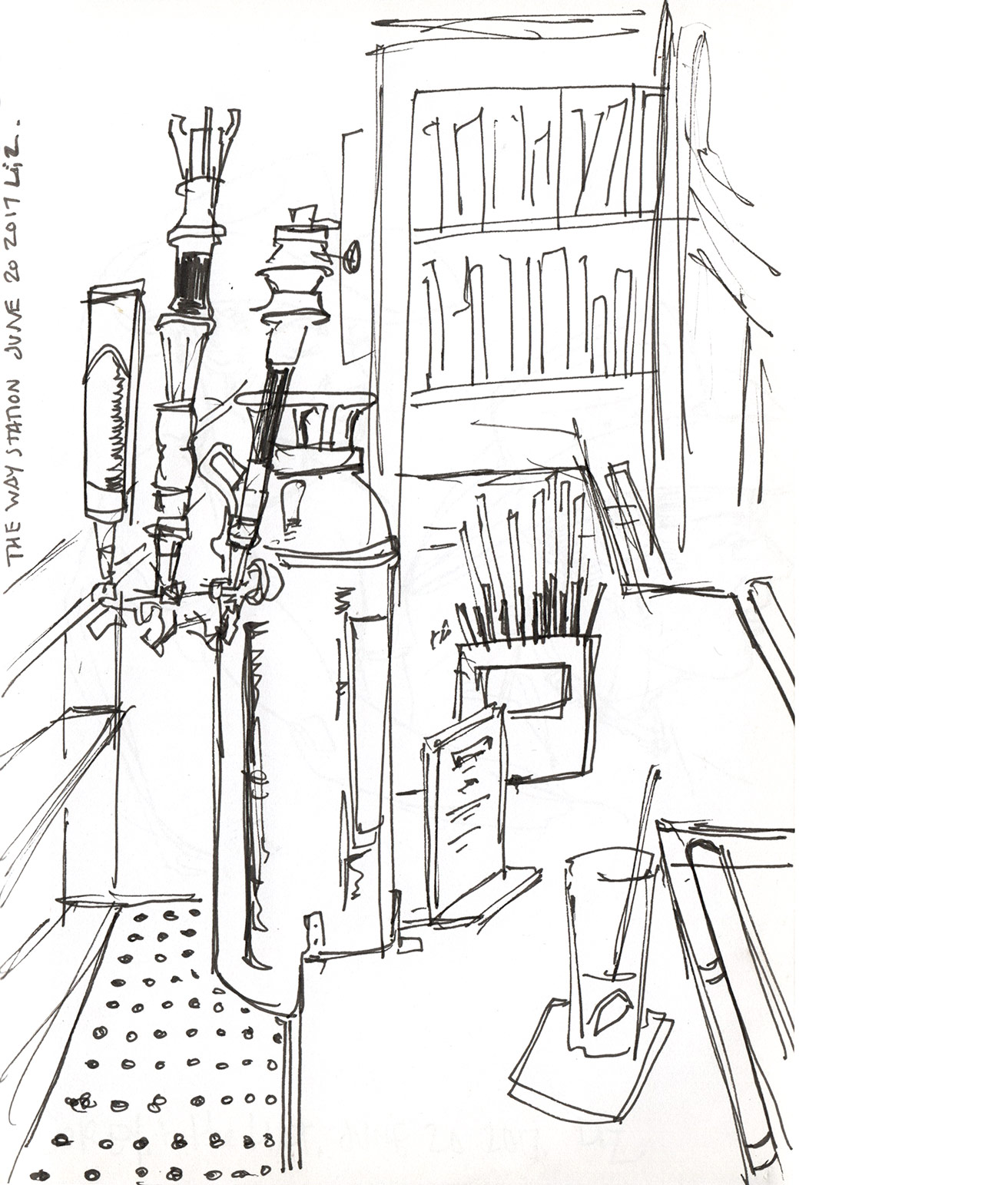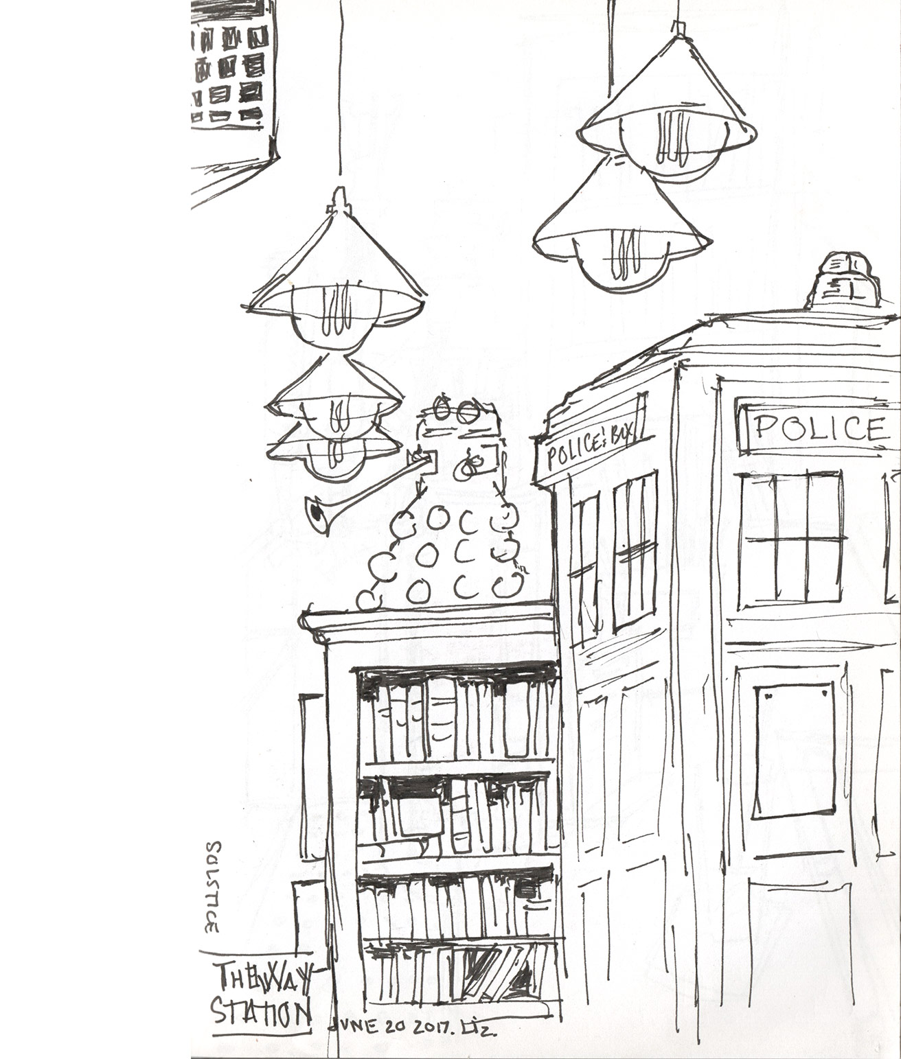 In the meantime, some sketches from last evening. The world famous TARDIS restroom in The Way Station bar, and its attendant tiny library!