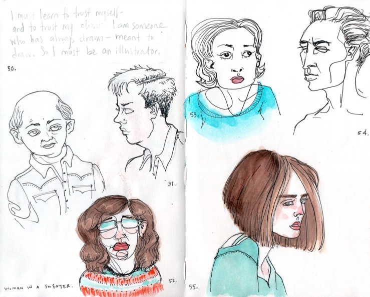 Well, I took up this challenge Monday (17th), and it’s now the 22nd, making today day six, but these are drawings from days three through five, and not in order. Just haven’t had time to finish and scan everything.