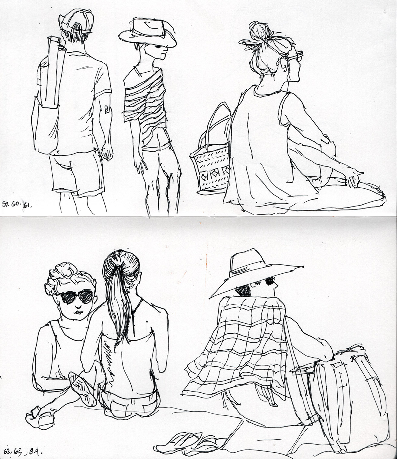 Well, I’m sorry to report that I lost steam in this challenge! Saturday was a scorcher, and I did these few drawings while waiting for the ferry and at the beach, but not enough. And Sunday, well, Sunday I was exhausted and the thought of 36 more drawings was too much. I will continue drawing people, obviously (it’s one of the things I do), and will re-visit this challenge again.