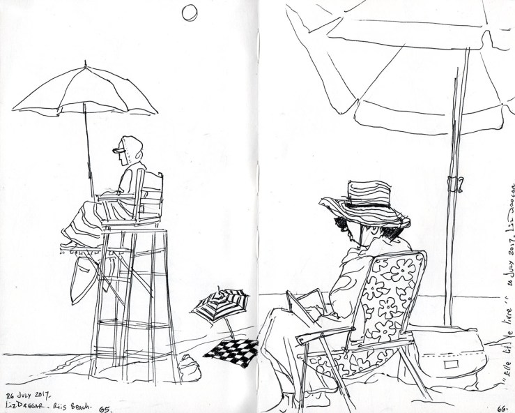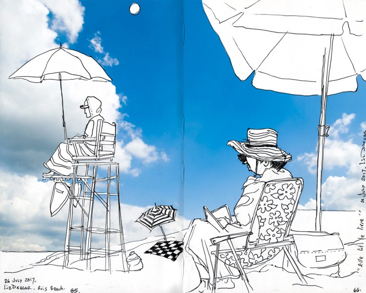 Another half day spent at the beach, and two more people added to the sketchbook. I also made a silly little movie of sea birds —fluttering, fighting, and diving as they do— posted on Instagram.