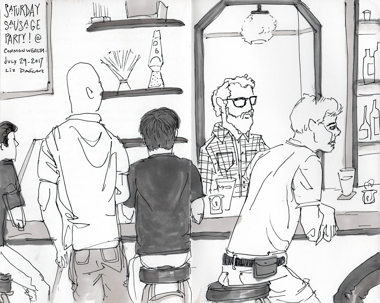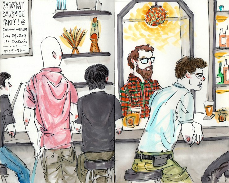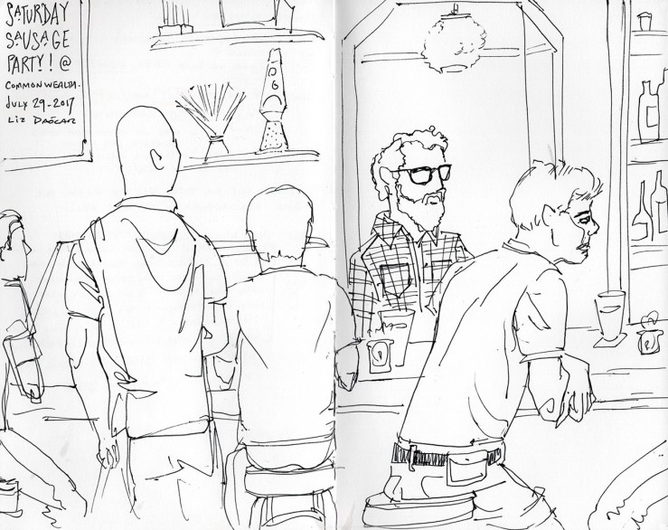 Here’s a sketch I did on the weekend; the view from a corner table. There was no place to sit at the bar, and the whole length of it was occupied by men. hence the snarky little title in the upper left. This is perhaps a 15-20 minute sketch done directly in ink.