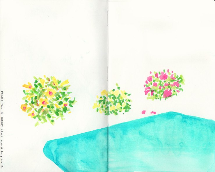Here’s a scene from the deck of our little house in Cherry Grove. I had it in mind that I’d start with some color then go in and add structure with pen, but I quite liked how serene and unfettered this looked so decided to leave it as mere suggestions of the pool and flower pots.