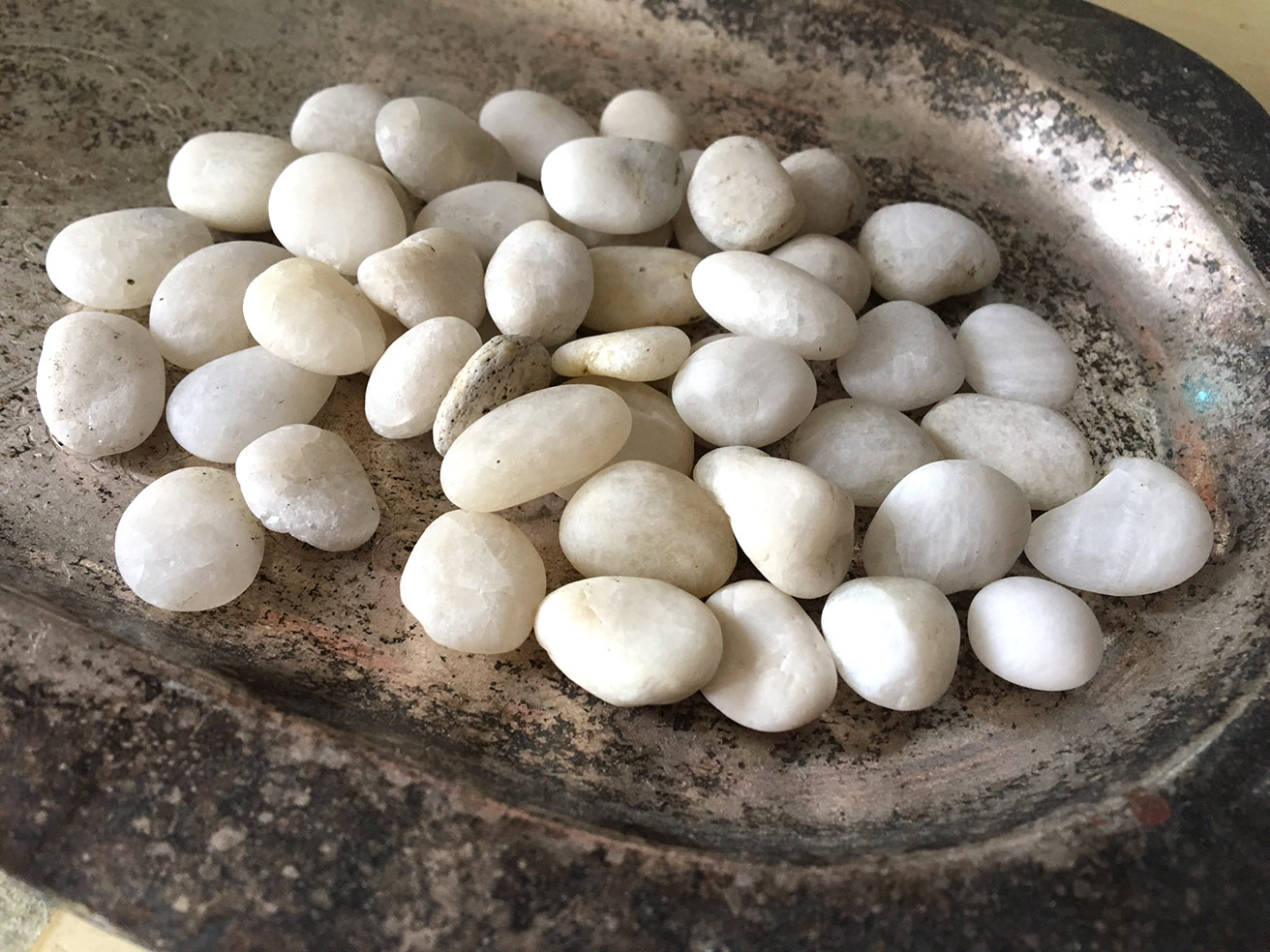 She has a board game called Mancala; a game of simple play but infinite possibilities, strategy-wise. It uses a simple board of hollows, through which players move the 48 pieces. Hers is a fine wooden board, but came with un-pretty, too-large, weird hued marbles. So I volunteered to collect sea stones of more appropriate size— and lovelier for being from the raw outdoors.