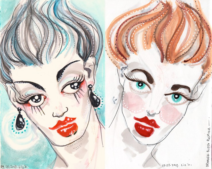 Here is a repeat of half of a spread I posted several days ago, paired with a new painting that I did on the back of the same page. The markers had bled through, leaving a ghost on the obverse, and once I had the half-pans out, I couldn’t resist painting a new face over it.