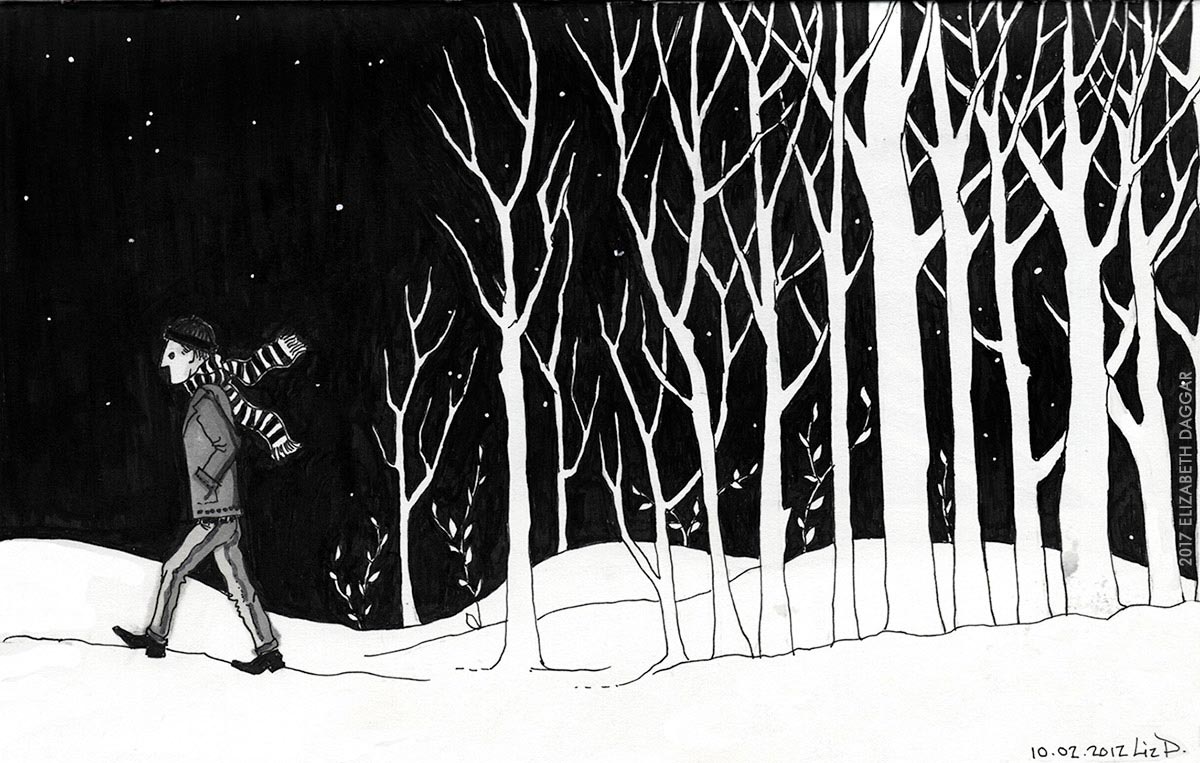 There was a small woods across the street from the farm. Before the people bought the land and built the large farmhouse and attendant stables and fenced-in pastures, it had been a winter wheat field. If you walked across or around to the back of that field, you’d come upon a picturesque little meadow, hemmed in by trees across which was hidden a lovely woods with a little ribbon of stream running through. It was pretty at all times of year, but in Winter it truly felt like a magical realm, far away from the world.