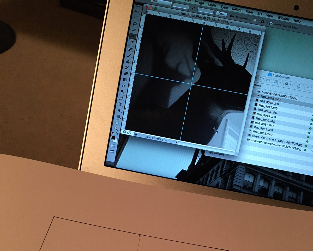 drawing process photoTo begin, I bring the image up on my little laptop and add the most basic grid as a reference for scale and proportion, which really speeds the plow in terms of getting things down in pencil.