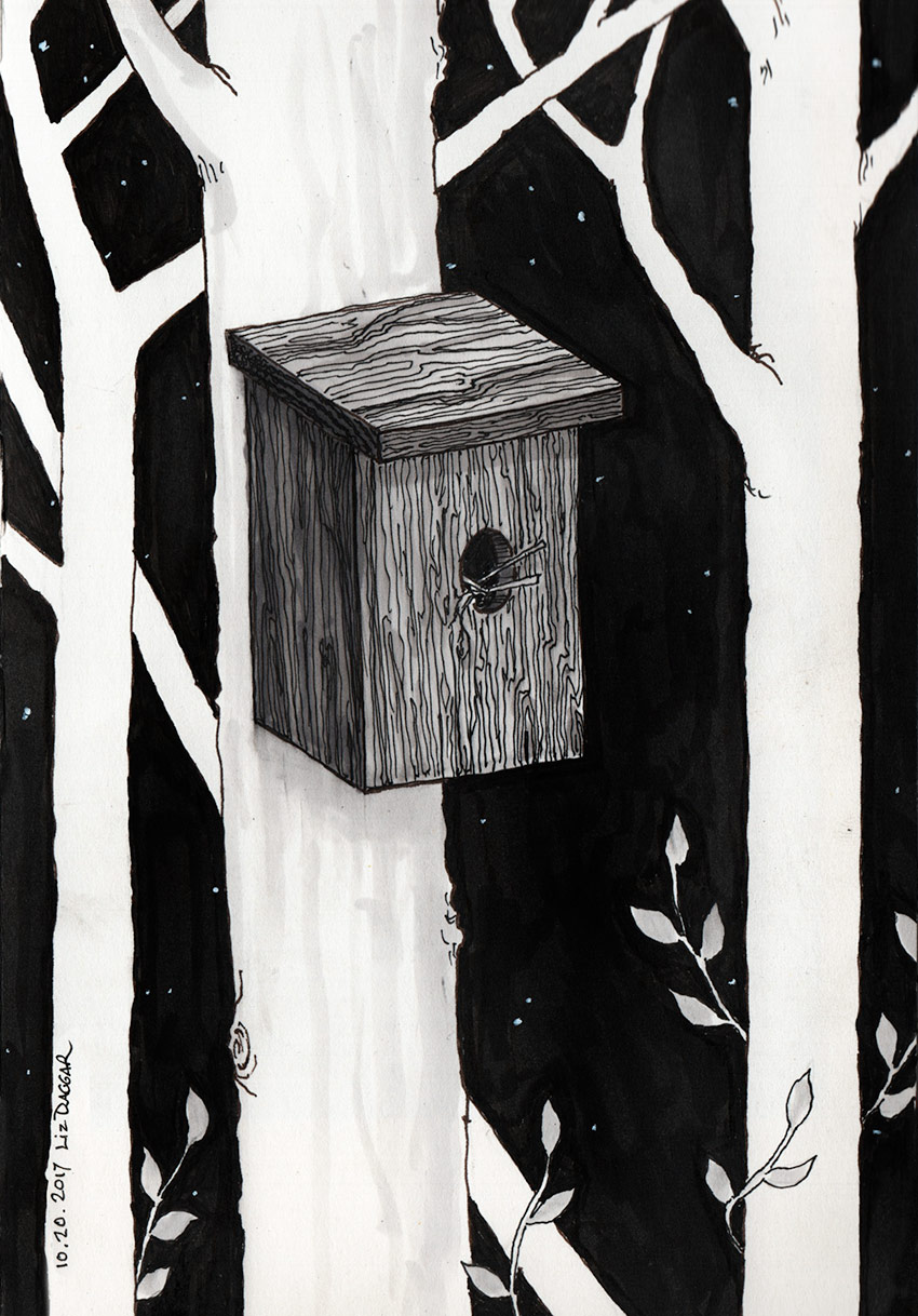 A simple, hand-made bird house adorned one of the trees near the house. It was lived in, and a few strands of bedding straw poked out its cozy doorway.