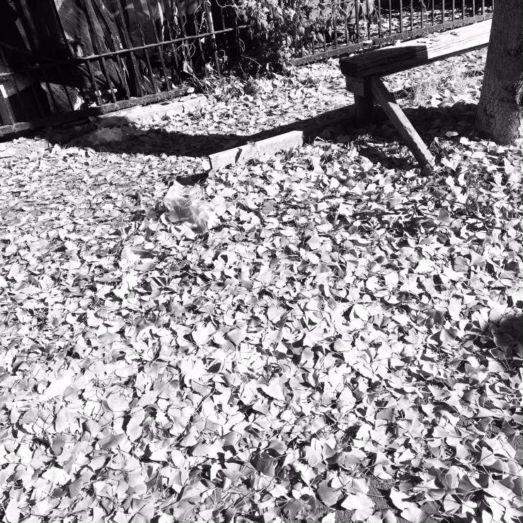 The ginko tree busied itself all summer, photosynthesizing, etc., suddenly there’s a cold snap, it looks up, realizes it’s not in China, but rather some city street in North America, and drops its leaves in shock. It’s ok, it’s tough and lives for two thousand years. Yes, deep breaths, let the air out slowly – -twice as long as it took to breathe in, it actually helps.