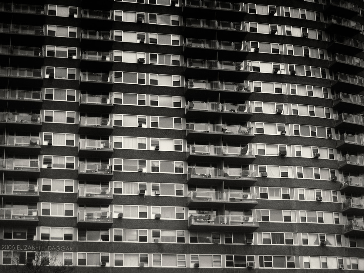 b&w photo of a building facade with many windowsA hundred eyes look upon us but they cannot see us