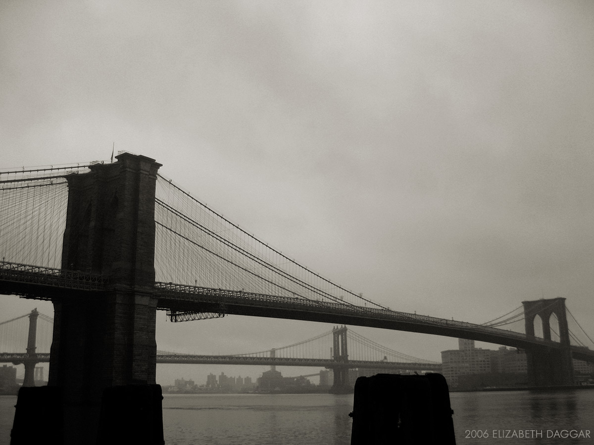 b&w photo pf brookly nbridge, manhattan bridge in distanceTwo bridges in fog and no one to cross them