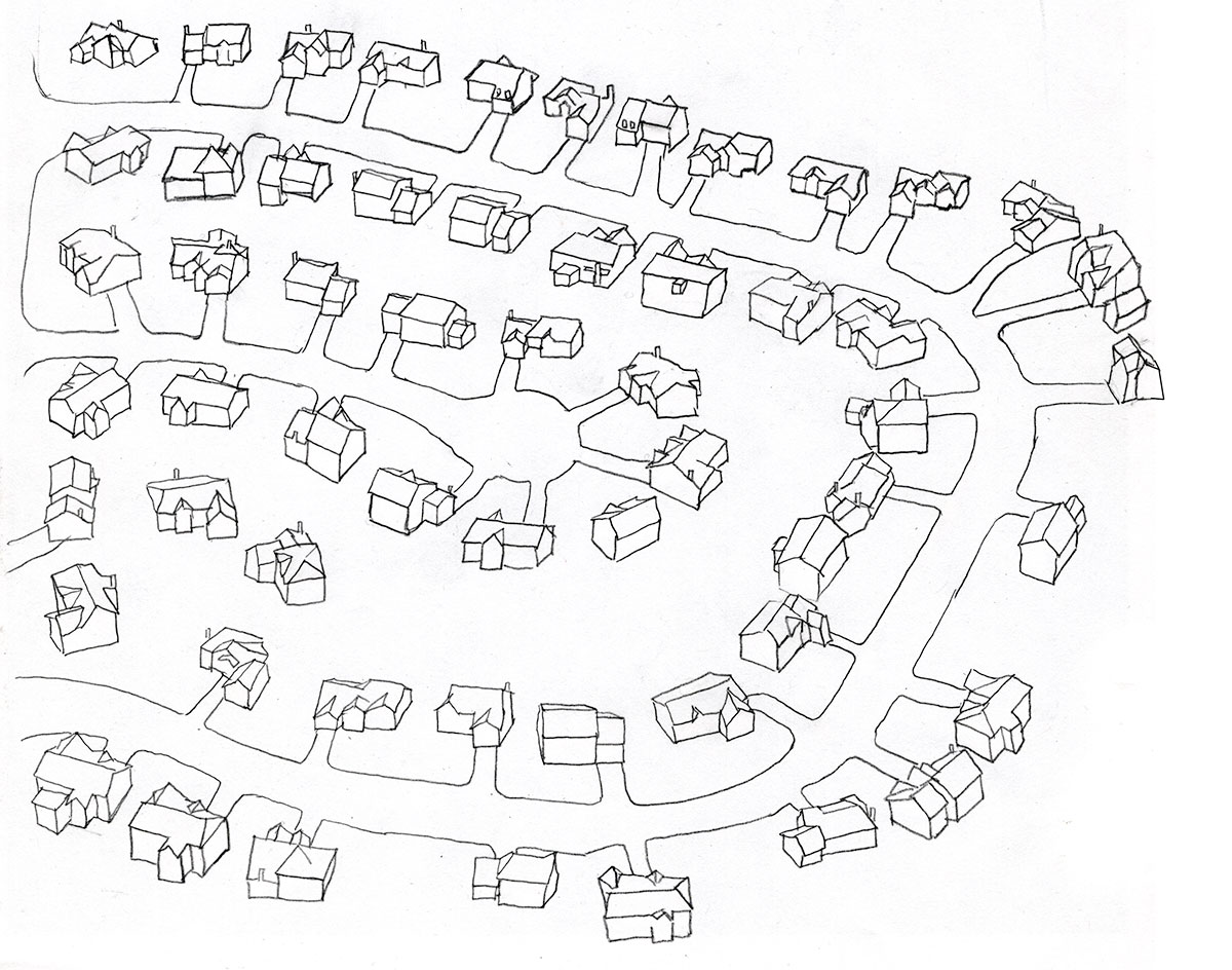Above: sketch of a suburb— viewed from the spire, as it were. A suburb represents, to me, a place that lacks the most wonderful parts of both cities and wide open spaces*; A pattern imposed; a restrictive one— made to serve its developer’s purpose rather than its inhabitants. Sometimes, life feels that way, no?