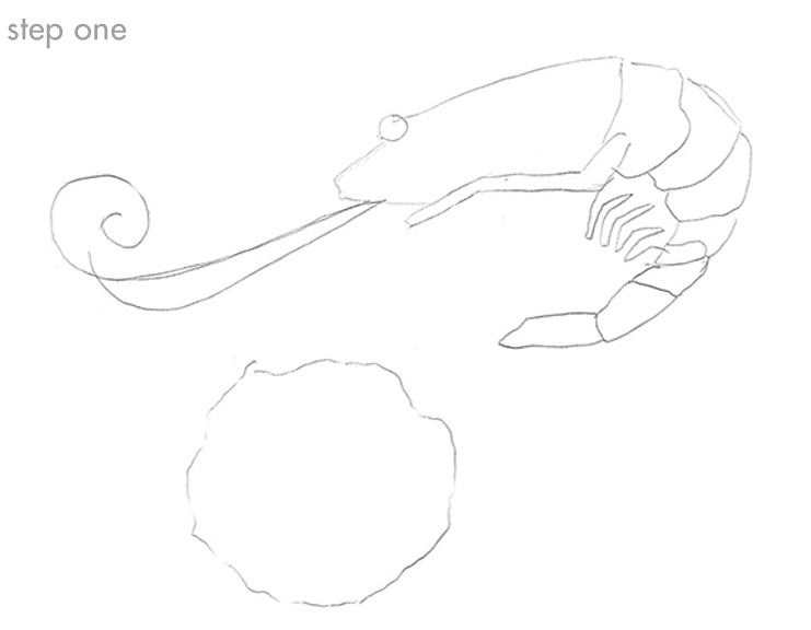 Step four: Scan your watercolors and import to Illustrator. Using your vector shapes, you can create a clipping mask for your hand-painted fills. (For this little prawn, I matched the color of his feelers to the paint, and kept the vector circle as his eye.)