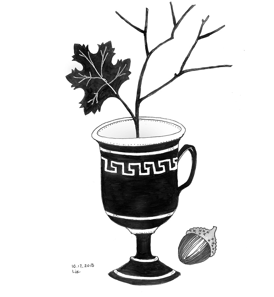I realized almost immediately after inking this that my leaf and acorn are troublesome, as the leaf is of the Maple sort, and acorns are of Oaks, but I inked it this evening without any thought and then it was too late.