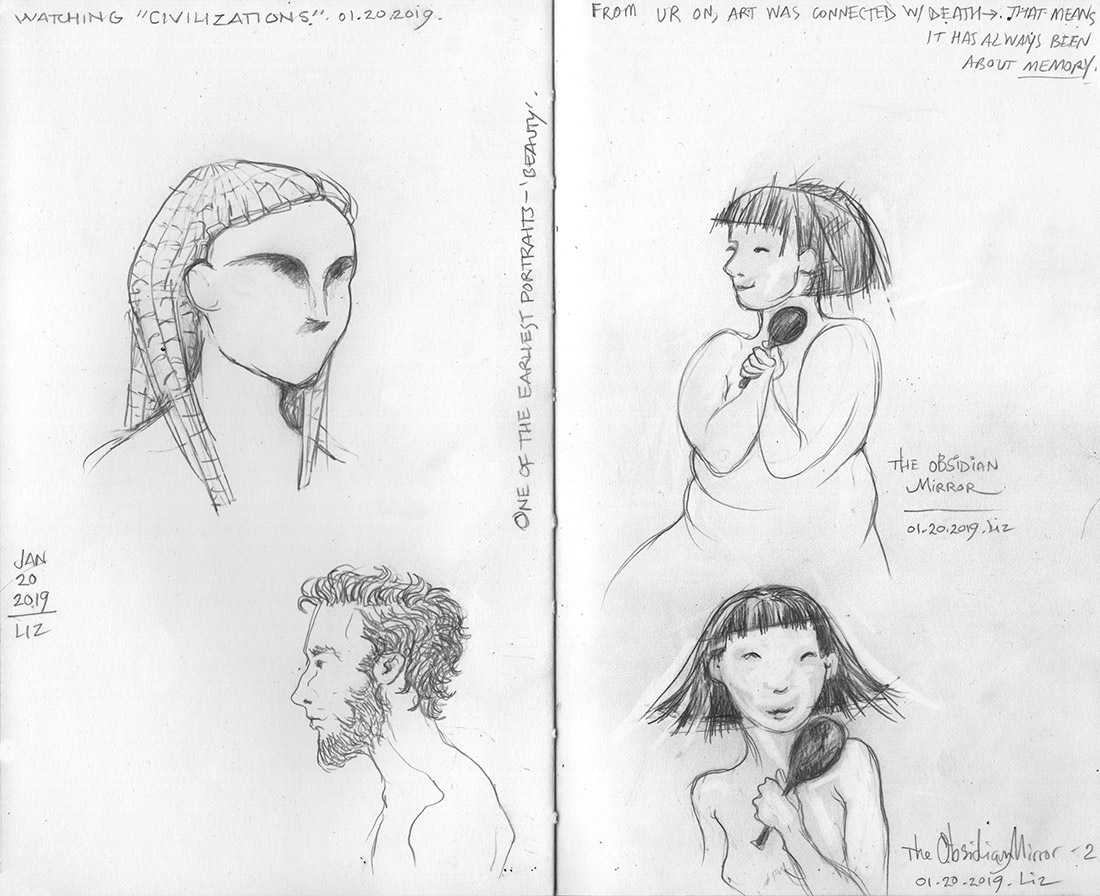 Last week I did the same thing while watching (re-watching) Civilizations. Some sketched interpretations of ancient art came from that session.